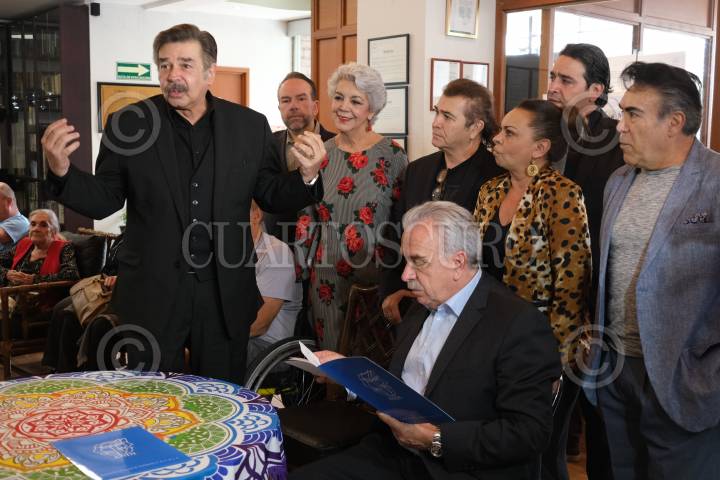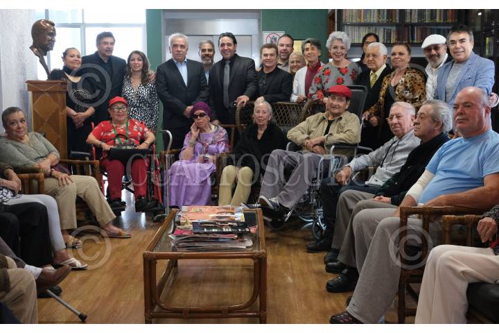 CIUDAD DE MÉXICO, 18JULIO2019.- José Ortíz de Pineda, Irina Areu, Iliana de la Garza, Jesús Monárrez, José Elías Moreno se tomaron una fotografía con los actores que viven en la Casa del Actor, al termino de la firma del convenio entre la Asociación Nacional de Intérpretes (ANDI) y la Casa del Actor, el cual tiene la finalidad de brindar mejores beneficios a los actores que viven en el inmueble. En la imagen, algunos actores reciben atención por parte del personal de la Casa del Actor. FOTO: GRACIELA LÓPEZ /CUARTOSCURO.COM