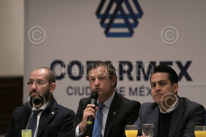CIUDAD DE MÉXICO, 13AGOSTO2019.- Gabriel Funez Díaz, presidente de Comisión Electoral; Jesús Padilla Zenteno, presidente de COPARMEX, y José Luis Jiménez Barrera, vicepresidente a Asociaciones y Vinculación, durante la conferencia de prensa en la que informaron sobre su posicionamiento sobre los bienes y servicios del consumidor en estos cinco meses. Se realizó en el Gran Salón Club de Banqueros. FOTO: GRACIELA LÓPEZ /CUARTOSCURO.COM