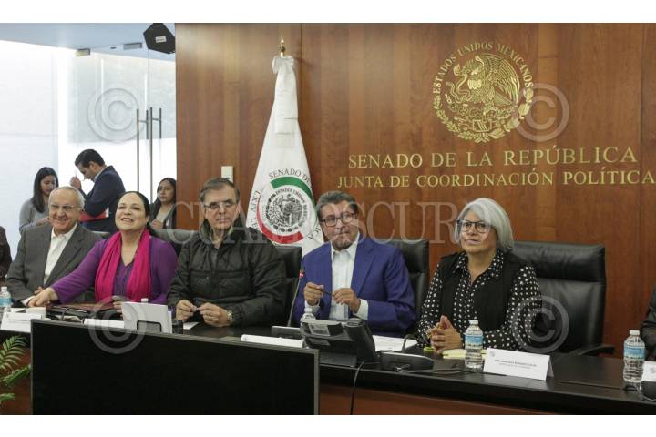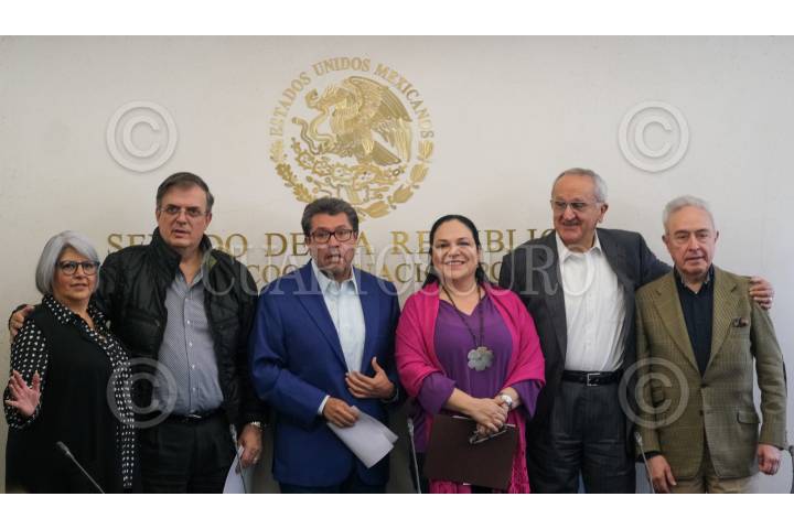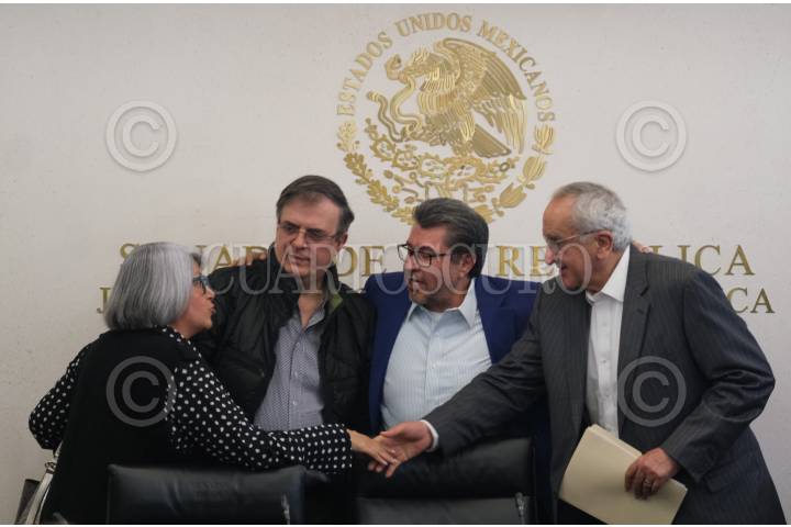Graciela Márquez, secretaria de Economía; el canciller Marcelo Ebrard; Ricardo Monreal, coordinador de Morena y de la Junta de Coordinación Política (JUCOPO); Mónica Fernández Balboa, presidenta de la mesa directiva en el Senado de la República, Jesús Seade, subsecretario para América del Norte, y Héctor Vasconcelos, presidente de la Comisión de Relaciones Exteriores, durante una conferencia de prensa en el Salón de Protocolo de la JUCOPO.