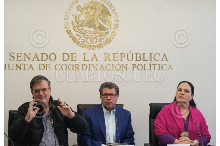 El canciller Marcelo Ebrard; Ricardo Monreal, coordinador de Morena y de la Junta de Coordinación Política (JUCOPO), yMónica Fernández Balboa, presidenta de la mesa directiva en el Senado de la República, durante la conferencia de prensa durante una conferencia de prensa en el Salón de Protocolo de la JUCOPO.