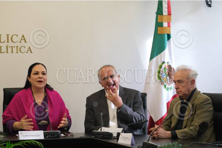 Mónica Fernández Balboa, presidenta de la mesa directiva en el Senado de la República; Jesús Seade, subsecretario para América del Norte, y Héctor Vasconcelos, presidente de la Comisión de Relaciones Exteriores, durante una conferencia de prensa en el Salón de Protocolo de la JUCOPO.