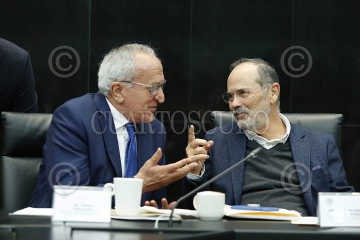 Jesús Seade conversa con el senador Gustavo A. Madero, durante la comparecencia