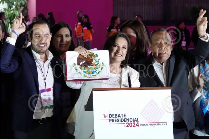 CIUDAD DE MÉXICO,07ABRIL2024.- Xóchitl Gálvez, candidata a la presidencia por el PAN, mostró el escudo de la bandera durante su salida del primer debate presidencial en las instalaciones del Instituto Nacional Electoral. La acompañaron Marko Cortés, presidente del PAN y Jesús Zambrano, presidente del PRD. FOTO: GRACIELA LÓPEZ /CUARTOSCURO.COM