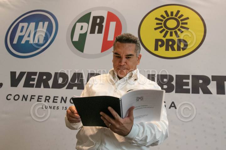CIUDAD DE MÉXICO, 15ABRIL2024.- Alejandro Moreno Cárdenas (PRI), durante la rueda de prensa en la que se dio a conocer que junto con sus aliados políticos PAN y PRD presentaron una denuncia penal ante la FGR ya que su adversario político Morena ha postulado a candidatos o sumado operadores políticos que cuentan con denuncias penales o han purgado condenas; como al ex gobernador Eugenio Hernández; Raymundo Martínez, ex alcalde de Toluca, o Eukid Castañón Herrera, ex operador político de los Moreno Valle. FOTO: MOISÉS PABLO/CUARTOSCURO.COM