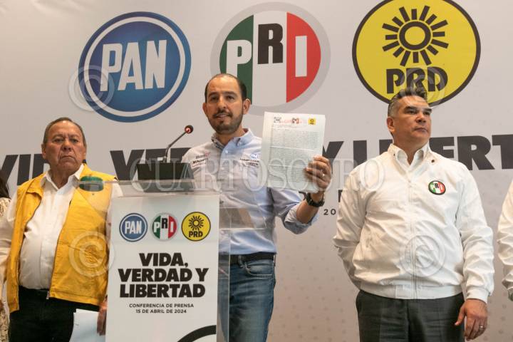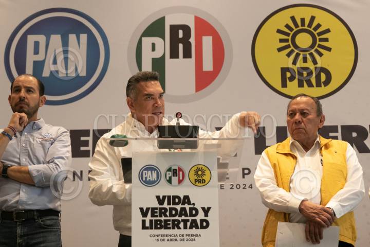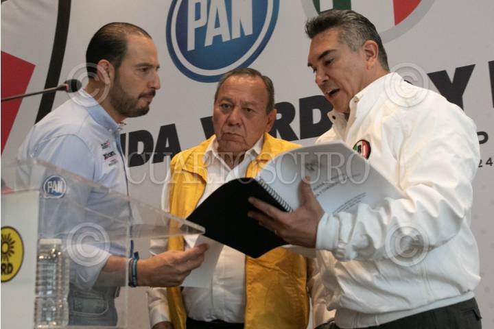 CIUDAD DE MÉXICO, 15ABRIL2024.- Los líderes partidistas Jesús Zambrano (PRD); Marko Cortés (PAN), y Alejandro Moreno Cárdenas (PRI), quienes conforman la alianza Fuerza y Corazón por México ofrecieron una conferencia de prensa para dar a conocer que presentaron una denuncia penal ante la FGR ya que su adversario político Morena ha postulado a candidatos o sumado operadores políticos que cuentan con denuncias penales o han purgado condenas; como al ex gobernador Eugenio Hernández; Raymundo Martínez, ex alcalde de Toluca, o Eukid Castañón Herrera, ex operador político de los Moreno Valle. FOTO: MOISÉS PABLO/CUARTOSCURO.COM