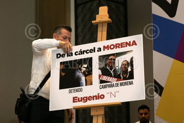 CIUDAD DE MÉXICO, 15ABRIL2024.- Durante la rueda de prensa de los líderes partidistas Jesús Zambrano (PRD); Marko Cortés (PAN), y Alejandro Moreno Cárdenas (PRI), mostraron imágenes del exgobernador priista Eugenio Hernández, una de ellas aparece con la candidata presidencial Claudia Sheinbaum, para denunciar que Morena a postulado a candidatos que tienen denuncias penales. Como el de Eugenio "N", quien es cuenta con denuncias en Estados Unidos. FOTO: MOISÉS PABLO/CUARTOSCURO.COM
