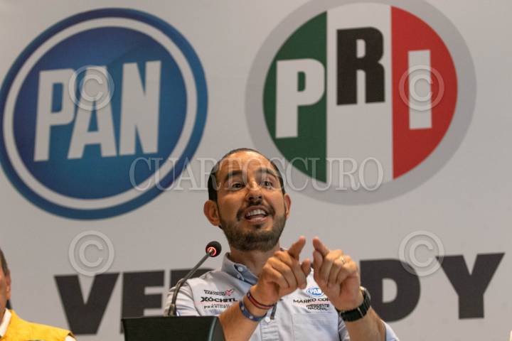 CIUDAD DE MÉXICO, 15ABRIL2024.- Marko Cortés (PAN), durante la conferencia de prensa en la que se informó que junto con sus aliados políticos PAN y PRD presentaron una denuncia penal ante la FGR ya que su adversario político Morena ha postulado a candidatos o sumado operadores políticos que cuentan con denuncias penales o han purgado condenas; como al ex gobernador Eugenio Hernández; Raymundo Martínez, ex alcalde de Toluca, o Eukid Castañón Herrera, ex operador político de los Moreno Valle. FOTO: MOISÉS PABLO/CUARTOSCURO.COM