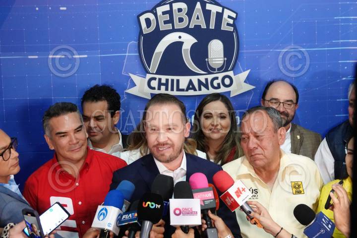 CIUDAD DE MÉXICO, 21ABRIL2024.- Santiago Taboada, candidato a Jefe de Gobierno por el PRI-PAN-PRD, acompañado de su esposa Fernanda Chávez, Jesús Zambrano, presidente del PRD, y Alejandro Moreno, presidente del PRI, durante su salida del Segundo Debate Chilango en las instalaciones del Grupo MVS. FOTO: GRACIELA LÓPEZ /CUARTOSCURO.COM