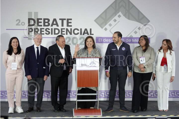 CIUDAD DE MÉXICO, 28ABRIL2024.- Xóchitl Gálvez, candidata a la presidencia por la coalición "Fuerza y Corazón por México", acompañada de Marko Cortés, presidente del PAN, Alejandro Moreno, presidente del PRI, Jesús Zambrano, presidente del PRD, y otros militantes, durante su salida en el Segundo Debate Presidencial en las instalaciones de Estudios Churubusco. FOTO: GRACIELA LÓPEZ /CUARTOSCURO.COM