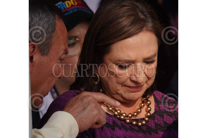 CIUDAD DE MÉXICO, 07MAYO2024.- Jesús Zambrano, presidente Nacional del PRD, y Xóchitl Gálvez, candidata a la presidencia "Fuerza y corazón por México", durante un mitin en Plaza San Matías. FOTO: GRACIELA LÓPEZ /CUARTOSCURO.COM