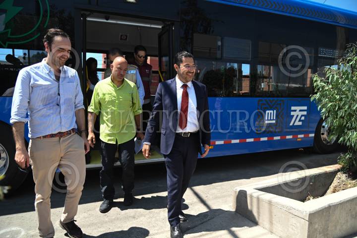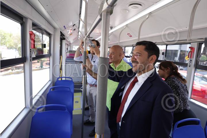 CIUDAD DE MÉXICO, 20MAYO2024.- Jesús Esteva, secretario de Obras; Martí Batres, Jefe de Gobierno, y Andrés Lajous, secretario de Movilidad, supervisaron los avances de la Línea del Trolebús que recorre por avenida Aztecas. Los funcionarios recorrieron en una unidad las diferentes estaciones a partir de la estación Taxqueña. FOTO: GOBIERNO DE LA CIUDAD DE MÉXICO/CUARTOSCURO.COM