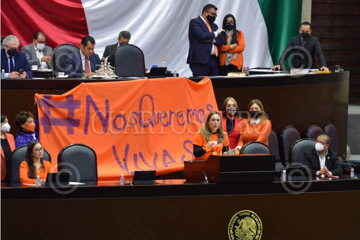 Jessica Ortega De la Cruz, diputada de MC, y compañeros de su bancada, durante su participación en la sesión solemne de la Cámara de Diputados con motivo del Día Internacional del la eliminación de la violencia contra la mujer.