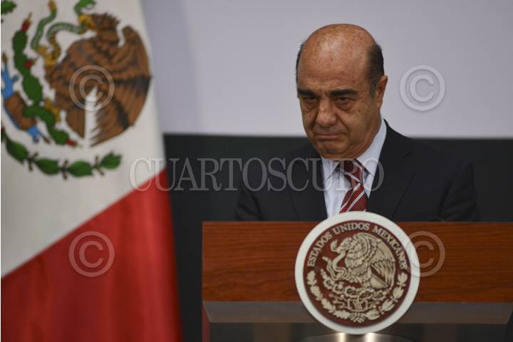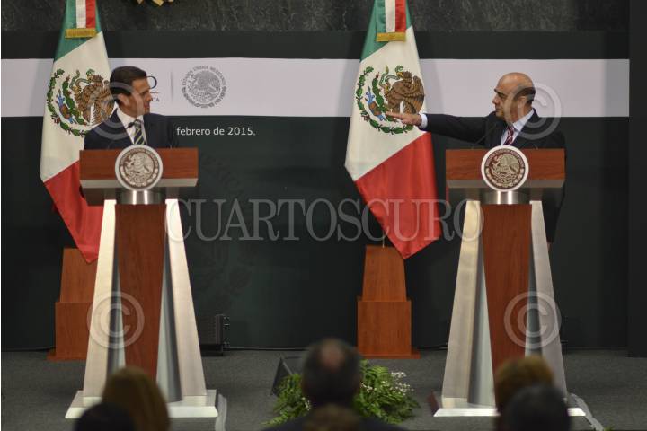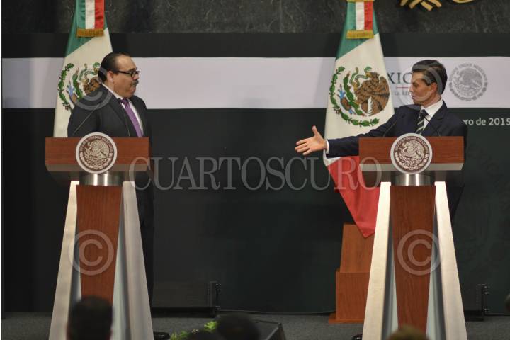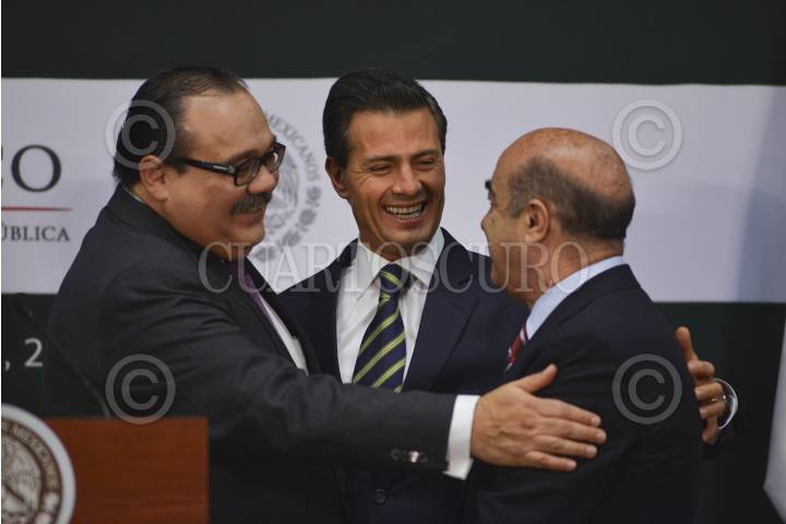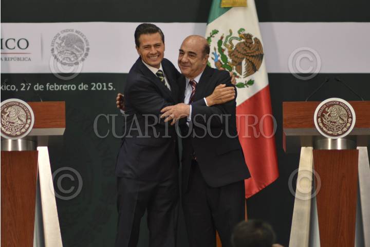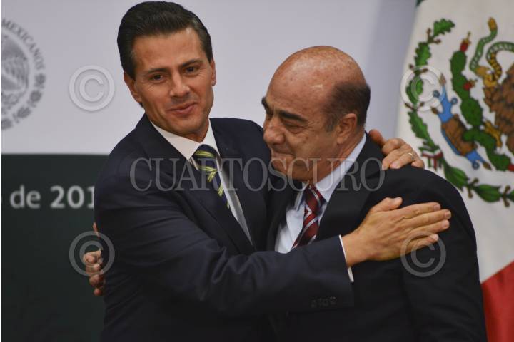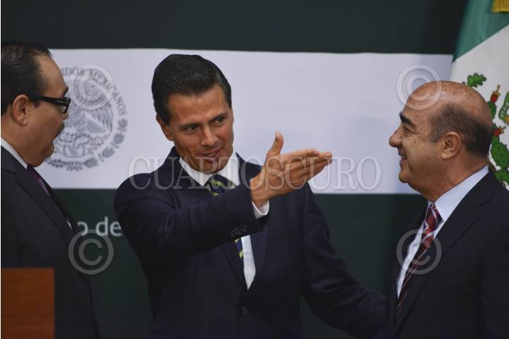 MÉXICO, D.F., 27FEBRERO2015.- Enrique Peña Nieto, presidente de México, tomó protesta a Jesús Murillo Karam, como el nuevo Secretario de Desarrollo Agrario, Territorial y Urbano, en sustitución de Jorge Carlos Ramírez Marín, quien competirá por una diputación. Durante la ceremonia, el presidente felicitó a ex procurador de la república, sobre todo, "por su gran actuación en el caso Iguala". FOTO: ADOLFO VLADIMIR /CUARTOSCURO.COM