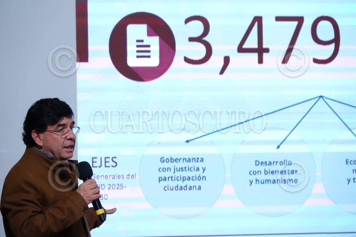 CIUDAD DE MÉXICO, 15ENERO2025.- Jesús Ramírez Cuevas, coordinador de Asesores de la Presidencia de la República, dio detalles sobre los foros organizador para exponer a la población las acciones del Plan Nacional de Desarrollo, durante la conferencia “Mañanera del Pueblo”. FOTO: GALO CAÑAS/CUARTOSCURO.COM