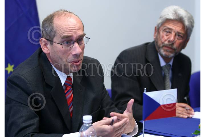 MÉXICO, D.F., 13ENERO2009.- Jiří Havlik, embajador de la República Checa y Mendel Goldstein, embajador de la Unión Europea, durante una conferencia de prensa en la cual se abordo la Presidencia Checa del Consejo de la Unión Europea, que es una presidencia rotativa (cada país miembro preside al consejo de la UE por seis meses). El país que precede determina la agenda de la Unión presenta los temas que considera más importante y de esta manera cada país tiene la posibilidad de influir en la orientación del conjunto. FOTO: MOISÉS PABLO/CUARTOSCURO.COM