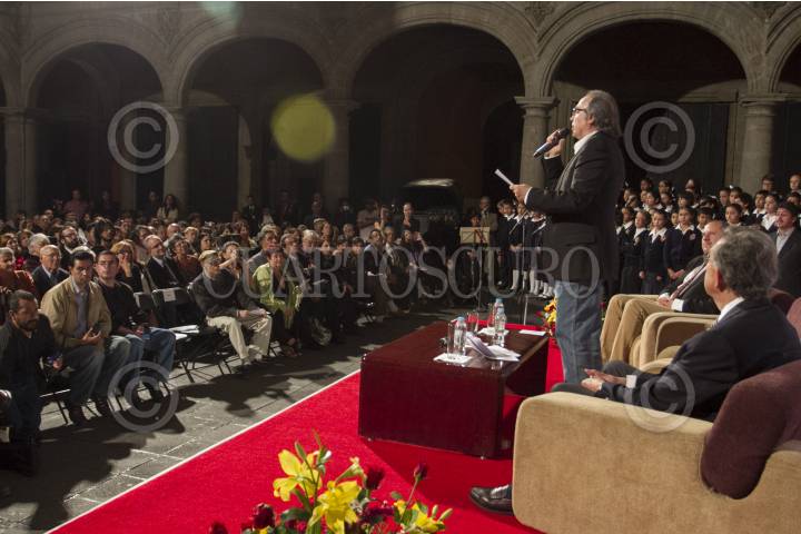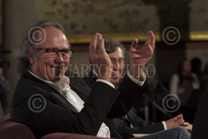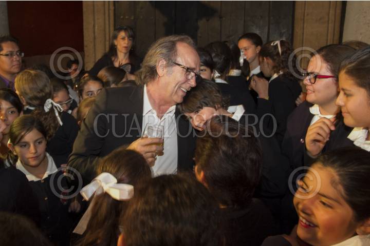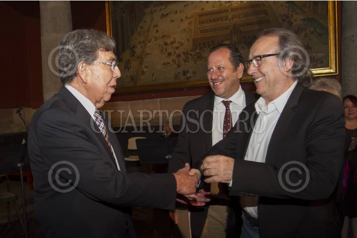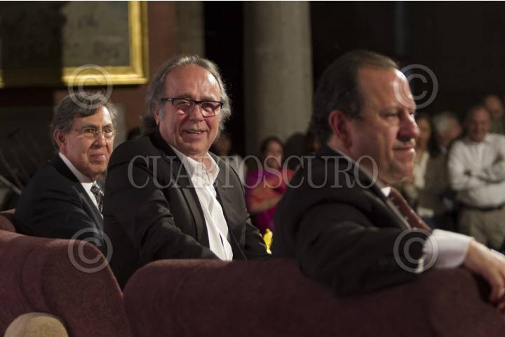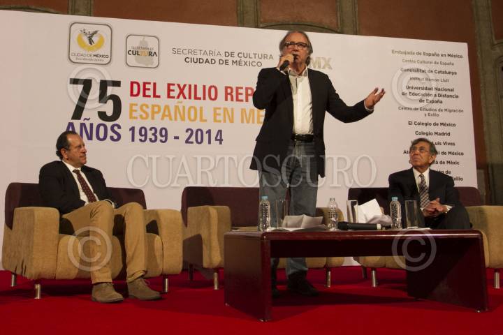 MÉXICO, D.F.,13MARZO2014.- Joan Manuel Serrat compositor y cantante español acompañado de Cuauhtémoc Cárdenas Solórzano Coordinador General de Asuntos Internacionales del Gobierno de la Ciudad de México y de Eduardo Vázquez Martín Secretario de Cultura del D.F., ofreció una conferencia en Museo de la Ciudad de México, para conmemorar 75 años del exilio republicano español en México. FOTO: GUILLERMO PEREA /CUARTOSCURO.COM