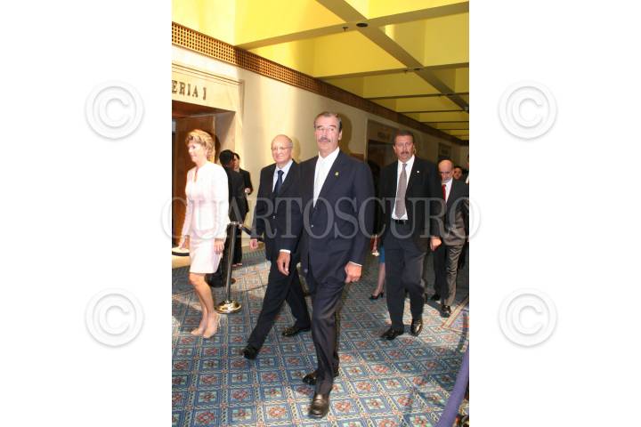 MÉXICO D.F. 08MARZO2006.- El presidente de la República, Vicente Fox, junto con los embajadores Gaëtan Lavertu y Joana Cretier, al termino de la reunión que sostuvo el primer mandatario con la Camara de Comercio de Canada. FOTO: Diego Gallegos/CUARTOSCURO.COM