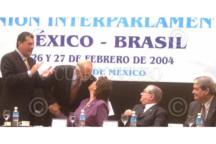México D.F 26Febrero 2004.- Cecilia Romero senadora del PAN, Enrique Jackson, presidente de la mesa directiva del Senado, y los diputados brasileños Eduardo Suplicy y Joao Castello durante la inauguración del intercambio cultural entre México y Brasil que se lleva a cabo en el Senado. FOTO: Eunice Adorno/CUARTOSCURO.COM