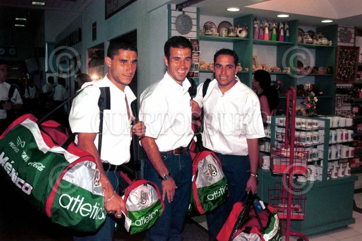 Con una alegría por su viaje Jorge Campos, Luis García, Joaquín del Olmo, Salvador Carmona, Gerardo Torrado y Cesario Victorino, llegan por el área de pistas para abordar el avión que los llevará aHonduras. FOTO: David Bolaños/CUARTOSCURO.COM