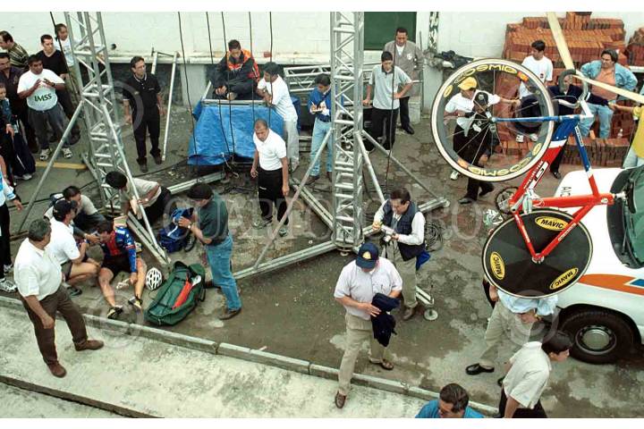 Este dia se celebraron las fase eliminatorias de la Copa Mundial de Pista , el estadunidense Johnny Bairos es atendido despues de caer de 10 metros de altura , donde se encuentra la pista donde se desarrollaba la carrera, su bicicleta quedo colgando de una tira de seguridad. FOTO: Germán Romero/CUARTOSCURO