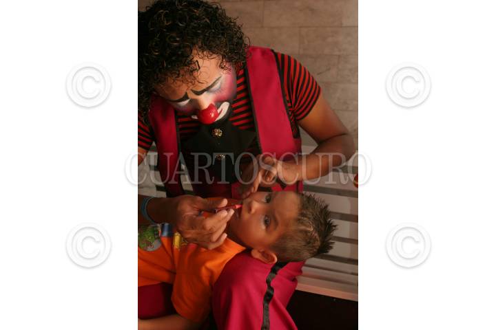 MÉXICO, D.F., 18OCTUBRE2006.- El payaso Peinetazo ayuda en su maquillaje a el payasito Johny Jr., para poder asistir a la toma de la fotografia oficial de XI Convención Interncional de Payasos. FOTO: MOISÉS PABLO/CUARTOSCURO.COM