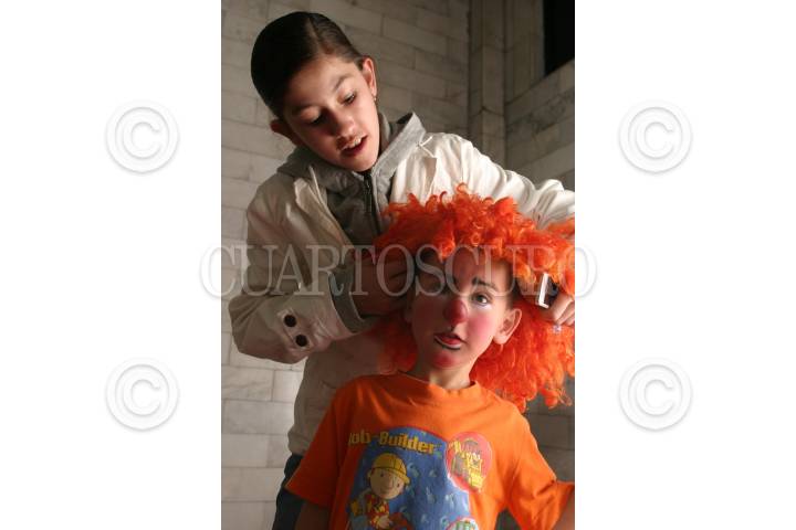 MÉXICO, D.F., 18OCTUBRE2006.- El payasito Johny Jr., es ayudado por su hermana a colocarse su peluca como parte de su preparación para poder participar en la caravana de la XI Convención Internacional de Payasos. FOTO: MOISÉS PABLO/CUARTOSCURO.COM