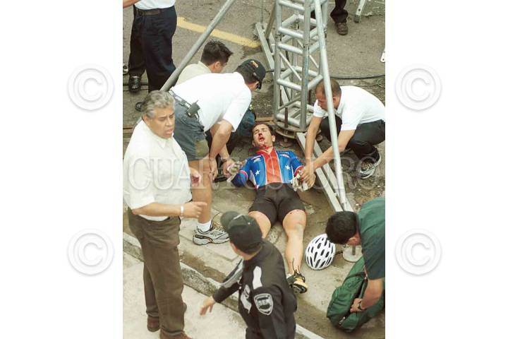 Este dia de celebraron las fase eliminatorias de la Copa Mundial de Pista , el estadunidense Johny Bairos es atendido despues de caer de 10 metros de altura , donde se encuentra la pista donde se desarrollaba la carrera. FOTO: Germán Romero/CUARTOSCURO