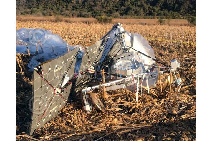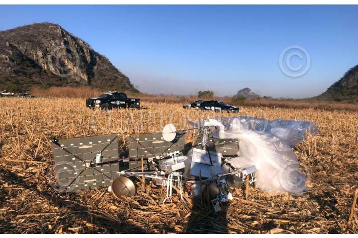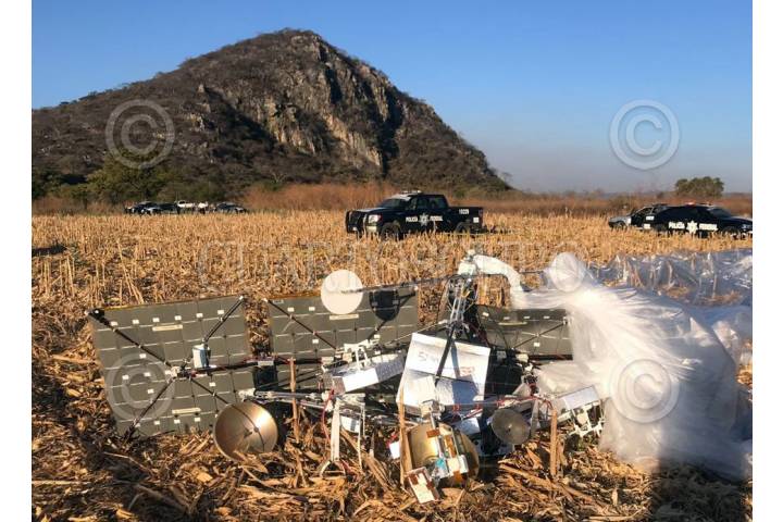 JONACATEPEC, MORELOS, 03FEBRERO2019.- Un globo estratosférico, que es usado para llevar internet a comunidades rurales, cayó en los campos de este municipio. El hallazgo se realizó esta tarde en el campo Ejidos, colindante con la localidad de Atotonilco, cuando personal de la Policía Federal observó un objeto metálico parecido a un satélite espacial. Tras una inspección los efectivos policiacos hallaron un instructivo que menciona el funcionamiento del objeto, los números de contacto para reportar su localización y recomendaciones para su manipulación. FOTO: CORTESIA POLICIA FEDERAL /CUARTOSCURO.COM