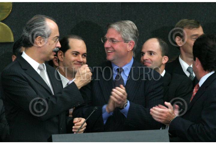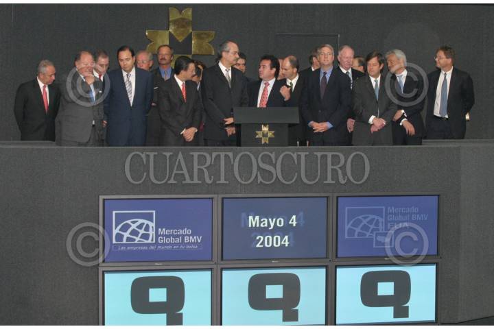 México, D.F. 04 MAYO 2004.- Ceremonia de inicio de sesión en la Bolsa Mexicana de Valores donde estuvieron presentes Francisco Gil Díaz, secretario de Hacienda, Jonh Jacob, titular de Nasdac y Guillermo Prieto, presidente de la BMV. FOTO: Sandra Perdomo/CUARTOSCURO.COM