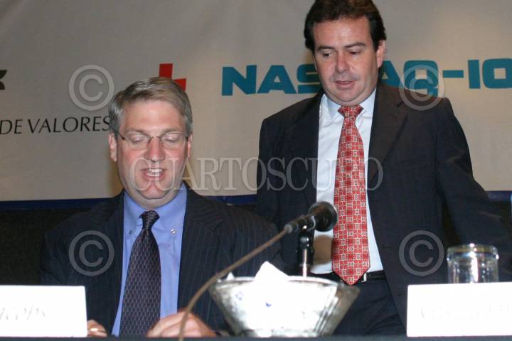 México, D.F. 04 MAYO 2004.- Conferencia de prensa encabezada por Jonh Jacobs titular de Nasdac y Guillermo Prieto y presidente de la BMV, luego de la ceremonia. FOTO: Sandra Perdomo/CUARTOSCURO.COM
