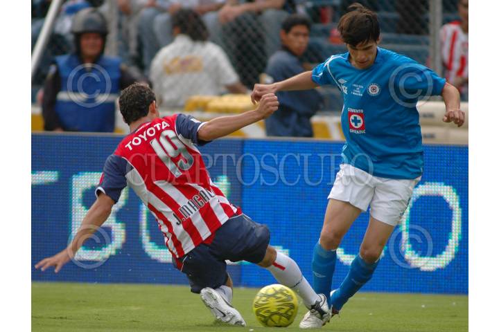 MÉXICO D.F., 01MARZO2008.- Pablo Daniel Zeballos de la maquina del Cruz Azul se enfrenta con el balón a Jonny Magallón de las chivas rayadas del Guadalajara en donde el partido quedo empadado a cero goles. FOTO: RODOLFO ANGULO/CUARTOSCURO.COM