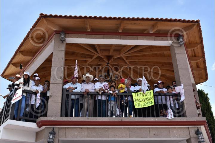 Simpatizantes observan el mitin político de Delfina Gómez, candidata a la gubernatura del Estado de México, por la coalición “Juntos Hacemos Historia” conformada por los partidos políticos: Morena, PT y PVEM.