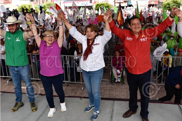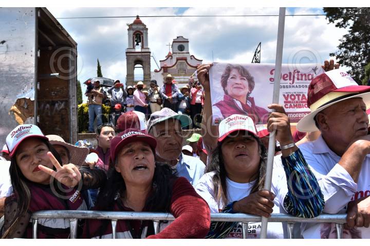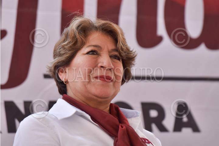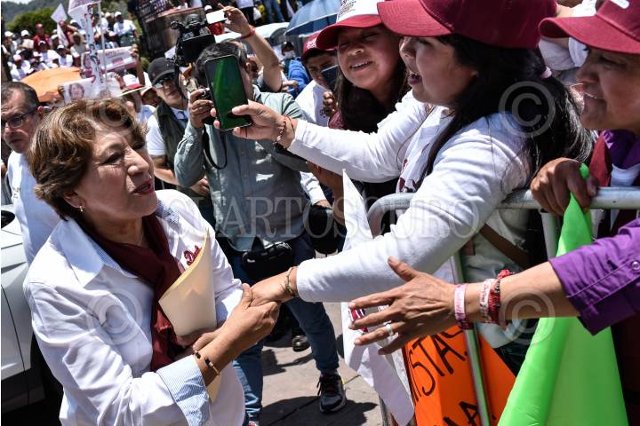 Delfina Gómez, candidata a la gubernatura del Estado de México, por la coalición “Juntos Hacemos Historia” conformada por los partidos políticos: Morena, PT y PVEM, durante su gira de campaña en la explanada de la entidad.