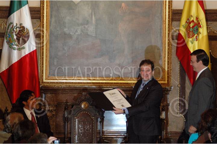 MÉXICO D.F., 12NOVIEMRBE2007.- Jordi Hereu alcalde de la ciudad de Barcelona, España; muestra el pergamino que lo nombra Huesped Distingido y es acompañado por el jefe de gobierno Marcelo Ebrard en el Salón de los Cabildos. FOTO: RODOLFO ANGULO/CUARTOSCURO.COM