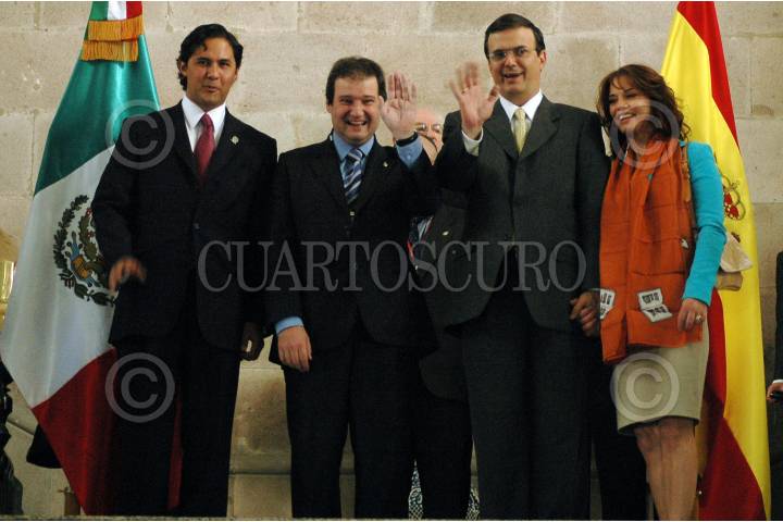 MÉXICO D.F., 12NOVIEMRBE2007.- Jordi Hereu alcalde de la ciudad de Barcelona, España; el jefe de gobierno Marcelo Ebrard que y su esposa Mariagna Prats saludan a los medios de comunicación. FOTO: RODOLFO ANGULO/CUARTOSCURO.COM