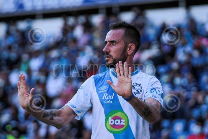 Jordi Cortizo (Puebla) pide calma a sus compañeros en el partido ante el Querétaro.