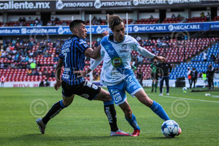 Jordi Cortizo (Puebla) intenta eludir a un rival del Querétaro.
