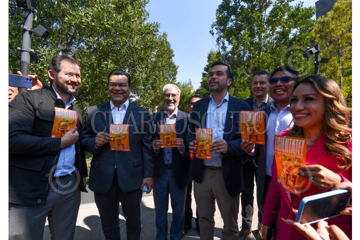 CIUDAD DE MÉXICO. 10JUNIO2025.- Sofía Castro, Luis Carbonell, Jorge Alvarez Maynez, Mariano Romero, candidato a alcalde en Papantla y Agustín Torres en la conferencia de prensa de Movimiento Ciudadano. FOTO: VICTORIA VALTIERRA/CUARTOSCURO.COM