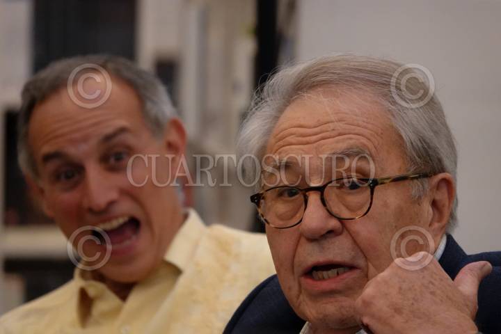 Jorge Alcocer, secretario de Salud y el poeta Óscar Barbolla se saludaron durante la presentación del libro "Exceso de muerte, de la peste de Atenas a la Covid-19", del autor Armando Bartra