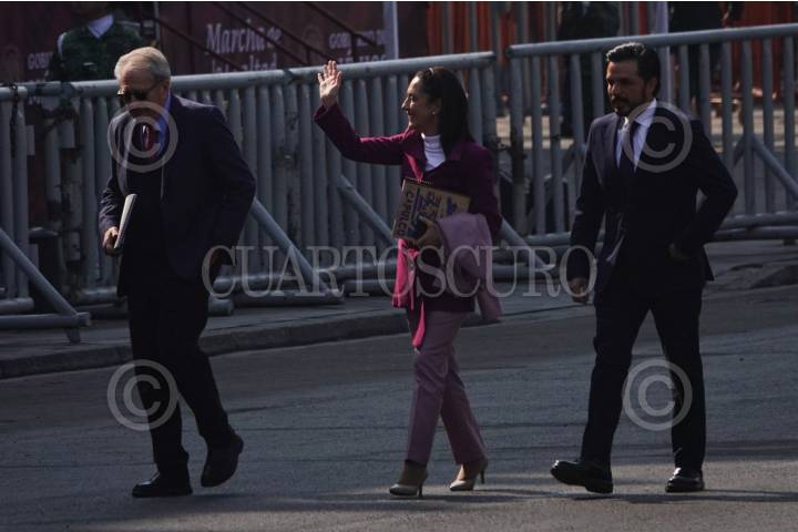 Jorge Alcocer Varela, secretario de Salud; Claudia Sheinbaum, jefa de Gobierno, y Zoe Robledo, director del IMSS, durante su llegada a la Marcha de la Lealtad, 110 Aniversario en la Plaza de la Constitución