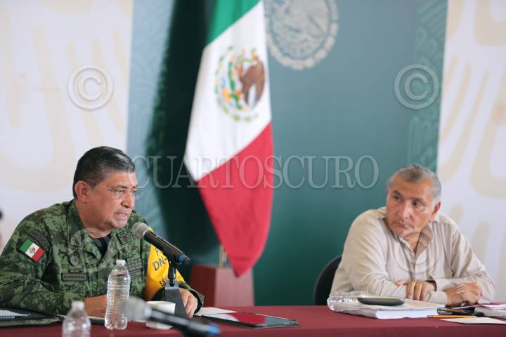 Luis Cresencia Sandoval; Adán Augusto López; Andrés Manuel López Obrador; Rosa Icela Rodríguez y Olga Sánchez Cordero durante la reunión de avances para el Plan de Apoyo a personas afectados por inundaciones en Villahermosa, Tabasco