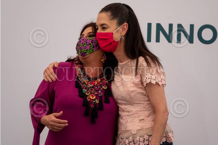 Clara Brugada y Claudia Sheinbaum durante la inaguración de la Línea 2 del Cablebús en Iztapalapa.