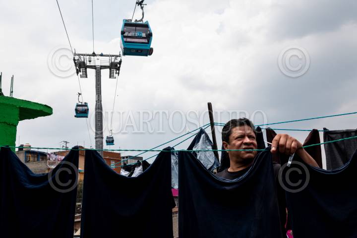 Un hombre tiende ropa en su azotea durante el primer día de operaciones de la Línea 2 del Cablebús.