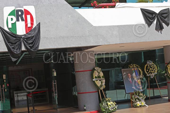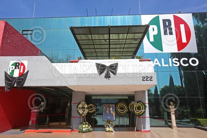 Una fotografía del ex Gobernador Jorge Aristóteles Sandoval Díaz, moños negros y coronas, fueron colocadas en las instalaciones del Comité Directivo Estatal del PRI.