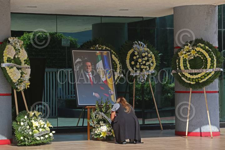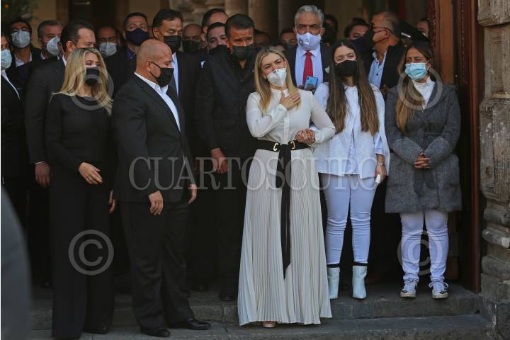 El Gobernador del Estado Enrique Alfaro, Lorena Jassibe Arriaga e Hija, durante la llegada del cuerpo del ex gobernador Jorge Aristóteles Sandoval a Palacio de Gobierno para rendirle homenaje esta mañana.