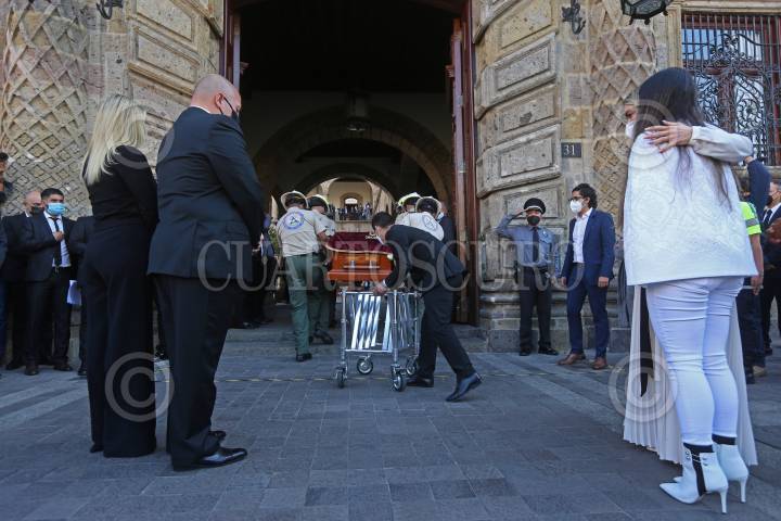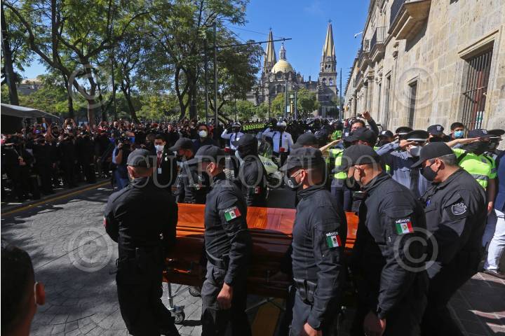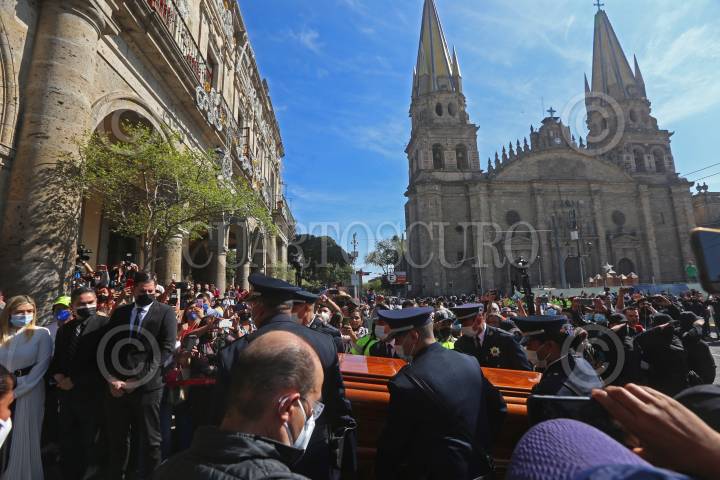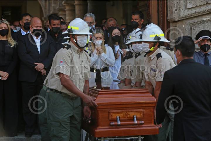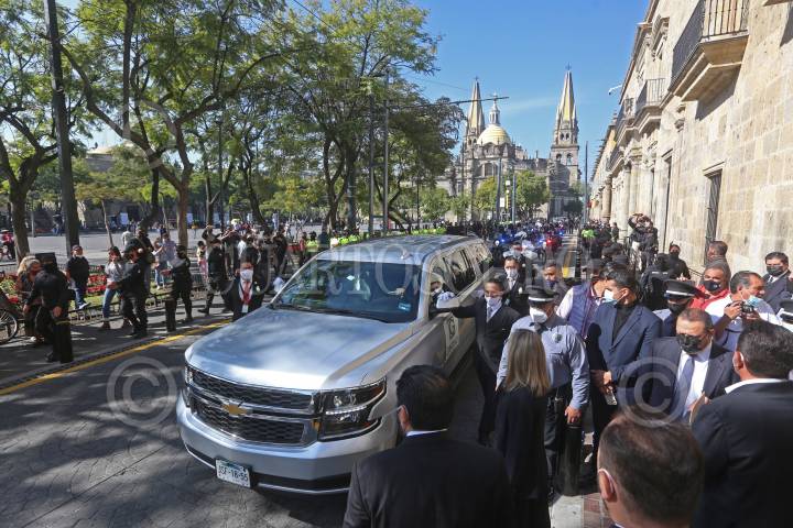 El féretro con el cuerpo del ex gobernador Jorge Aristóteles Sandoval Díaz, a la llegada al Ayuntamiento de Guadalajara donde le rindieron homenaje de cuerpo presente.