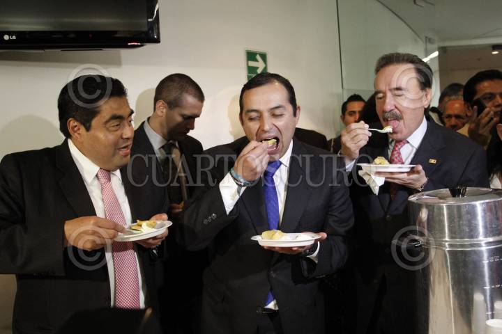 MÉXICO, D.F., 14FEBRERO2013.- Los senadores Miguel Barbosa, PRD, Jorge Emilio González Martinez, PVEM, Ernesto Cordero, PAN, y Emilio Gamboa, PRI, compartieron la tamaliza con los reportero de la fuente del Senado en la sala de prensa. FOTO: MOISÉS PABLO /CUARTOSCURO.COM