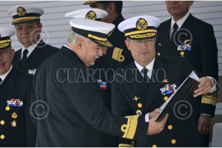 MÉXICO, DF, 02DICIEMBRE2013.- El Almirante Vidal Francisco Soberón Sanz, secretario de Marina, encabezó la “Ceremonia Solemne al Personal de la Categoría Almirante para su retiro”, entre 12 de ellos los almirantes Jorge Humberto Pastor Gómez, Armando García Rodríguez, Joaquín Cetino Angulo y Miguel Huerta Barragán. “Ustedes son ejemplo de un alto sentido de responsabilidad, dedicación, profesionalismo y madurez pues han asumido desde siempre un compromiso con el mar, México y nuestra alma máter”, mencionó el secretario al término de la ceremonia que finalizó con el himno nacional entonado por la banda de guerra de la infantería de marina. FOTO: MARÍA JOSÉ MARTÍNEZ / CUARTOSCURO.COM