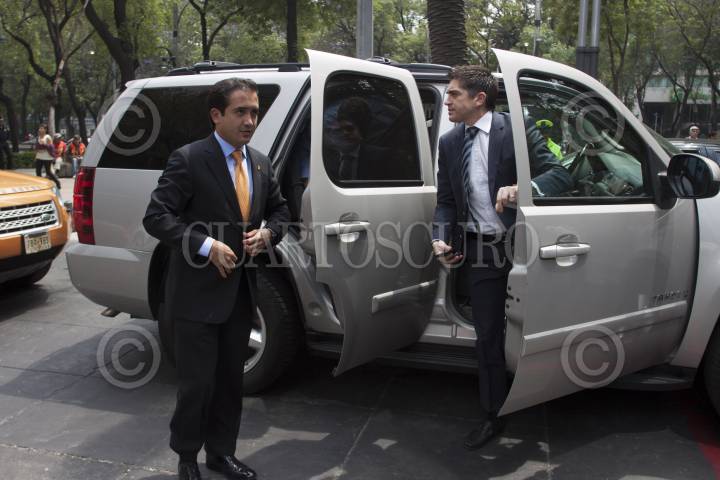 MÉXICO, D.F., 13MARZO2013.- Fernando Yunes Márquez, senador del PAN por Veracruz, y Luis Fernando Salazar, senador del PAN, acudieron a la PGR para interponer una denuncia penal en contra del gobernador de Veracruz Javier Duarte de Ochoa por desvíos de recursos por la cantidad de 5000 mil millones de pesos de la cuenta pública. FOTO: MOISÉS PABLO /CUARTOSCURO.COM