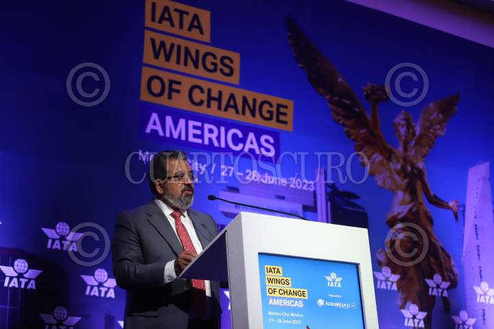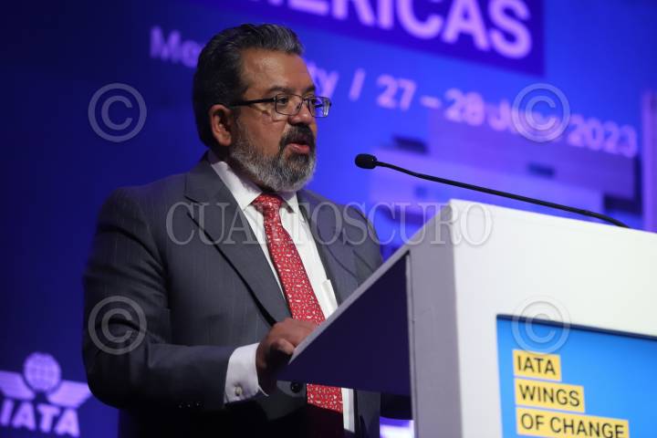 Jorge Nuño, titular de la SICT durante sus palabras de inauguración del foro Wings of Change Americas 2023 de la Asociación de Transporte Aéreo Internacional (IATA, por sus siglas en inglés).